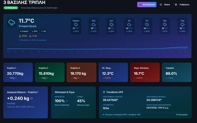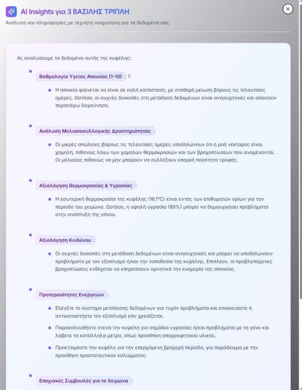 - Πληροφορίες σχετικά με το βάρος της μελισσοκυψέλης, τη θερμοκρασία και την υγρασία του περιβάλλοντος χώρου.