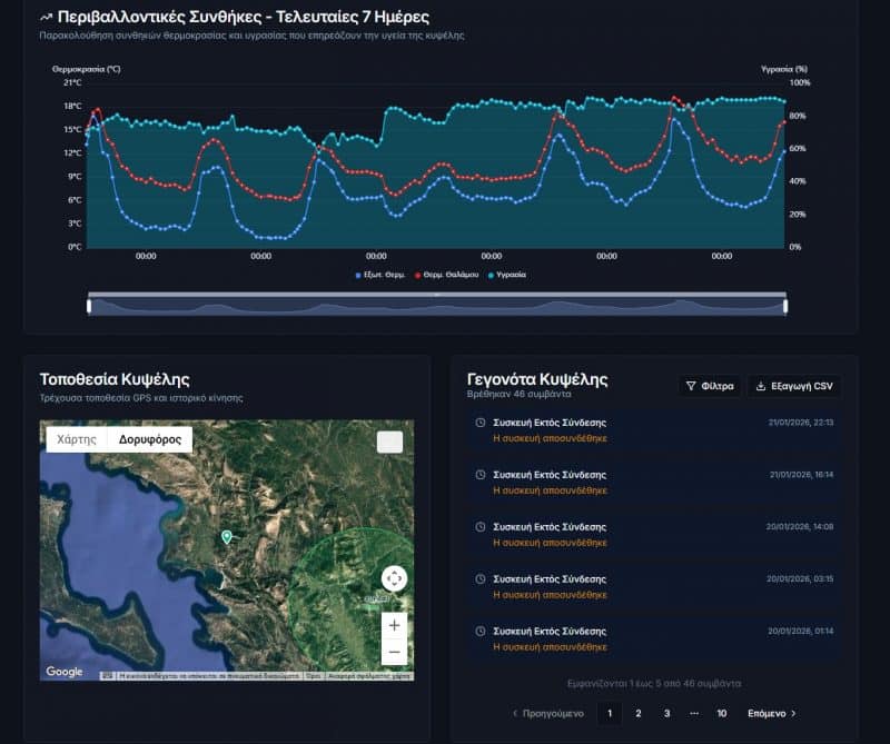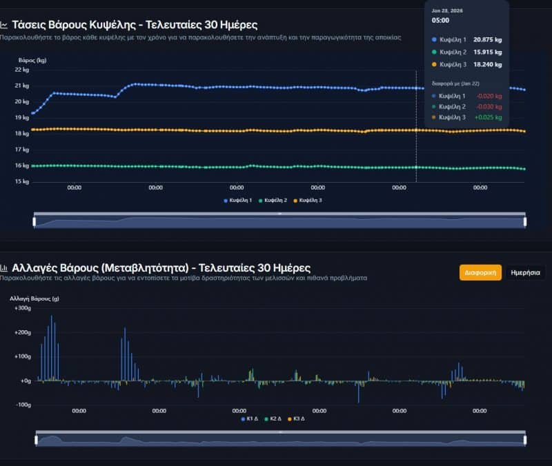 Η πλατφόρμα παρακολούθησης που βασίζεται σε Web εφαρμογή παρέχει παρακολούθηση των μελισσοκυψελών και εξασφάλιση της απόδοσης μέσω άμεσης ανίχνευσης μεταβολής βάρους και περιβαλλοντολογικών μεγεθών.